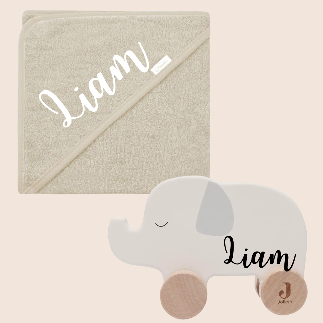 Daarbij voeg je een stijlvolle houten olifant toe – wit van kleur, met de naam van de baby subtiel bedrukt.